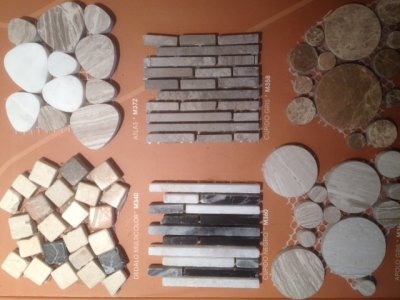 En las muestras puedes ver que los tamaños y formas no tienen porque ser siempre regulares, ni tan siquiera de forma cuadrada o rectangular. Tampoco el material tiene porque ser cerámico o el tradicional alicatado con teselas vítreas, podemos optar por la utilización de mármoles, granitos o cualquier otro material.