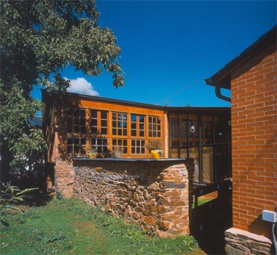 La construcción se basa en los sistemas tradicionales de muros de carga, de gran espesor e inercia térmica, con estructuras porticadas de madera para los forjados y cubiertas de lajas de pizarra sobre tableros de madera. El edificio consta de una solana, muy típica de la zona, para aprovechar los días calurosos y protegerse a la vez de las lluvias.