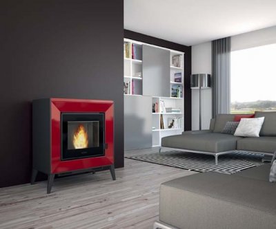 Las líneas limpias caracterizan el modelo Line, estufa de pellets que se inspira en el diseño sofisticado de los años 50. El uso del color aumenta la importancia de los detalles de las baldosas que brillan con la luz de la llama de la chimenea. Los tonos rojos brillantes, en un juego de contraste armónicos con el negro, destacan las lineas puras y rectas de la composición.