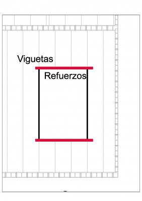 3-Cómo ves, hemos buscado abrir el hueco en el sentido de las viguetas para evitar romper más estructura de la debida. ¿Qué sucede en el otro sentido? En el otro sentido tendremos obligatoriamente que zunchar, es decir unir las viguetas que hemos roto. Esto es posible que nos obligue a colocar un refuerzo vertical de apoyo.