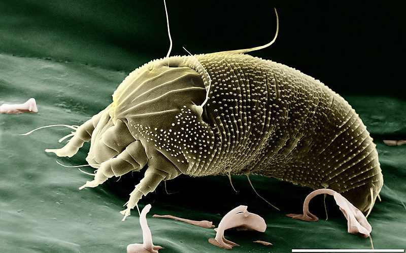 Los ácaros son minúsculos arácnidos que no alcanzan ni el milímetro de longitud (0,1mm) lo que los hace muy difícil de percibir por el ojo humano. Concretamente los ácaros domésticos, los del polvo de nuestras casas y los causantes de la alergia al polvo no llegan ni a los 0,5mm de longitud.