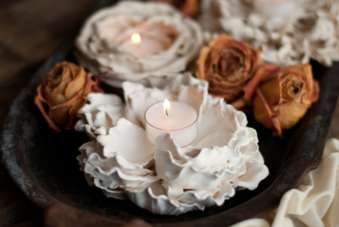 Estas flores las puedes utilizar para colocar en ellas pequeñas velas. Para ello tendremos que vaciar el corazón de la flor antes de meterlo en el recipiente con escayola y cortar el tallo en la base. Cuando saquemos la flor del yeso, la tendremos que colocar en una superficie plana para que se aplane la base y la podamos posteriormente apoyar en cualquier sitio