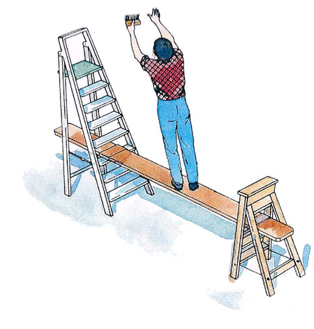 Cuando tengas que trabajar durante un rato a una altura determinada, lo más cómodo es instalar un pequeño andamio. Este andamio se puede hacer con dos escaleras pequeñas o bien con una escalera y una caja resistente, colocando un tablón entre ellas. También puedes conseguir unos caballetes que te pueden servir para colocar una plataforma apoyada en ellos y trabajar cómodamente.