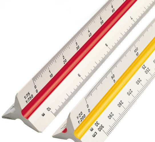 3-Para medir en un plano se utilizan los escalímetros, que son reglas calibradas que nos sirven para obtener una magnitud de forma rápida. Para usar un escalímetro lo que hacemos es buscar la escala del plano y colocar el escalímetro en la misma escala. Los escalimetros suelen traer varias escalas (1:50, 1:100, 1:150, 1:125, etc…)