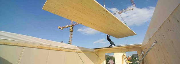 Construcción con paneles de madera contralaminada. Estamos acostumbrados a ver edificios prefabricados realizados a partir de paneles prefabricados de hormigón o estructuras ligeras de madera o metálicas, pero existe también la posibilidad de construir un edificio con paneles de madera contralaminada. (si quieres saber más sobre los paneles de madera contralaminada, te recomendamos que leas este artículo). En el mercado existen muchas empresas que comercializan este sistema, sobretodo empresas americanas o del norte de Europa. Una de ellas es KLH Massivholz, cuyo producto de paneles de madera contralaminada para la construcción de edificios te mostramos a continuación: