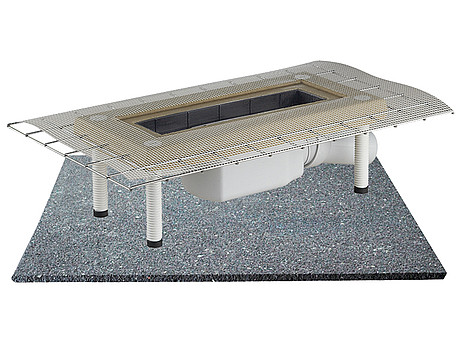 Desagüe lineal de acero inoxidable para duchas. Existen varias soluciones para resolver de una manera interesante los desagües de duchas o bañeras, una de ellas es utilizar el propio acabado y hacerle pequeñas hendiduras y agujeros por los que evacue el agua. Esto es posible en casos en los que el pavimento de la ducha lo realizamos in situ con piezas cerámicas pequeñas como el gresite.
