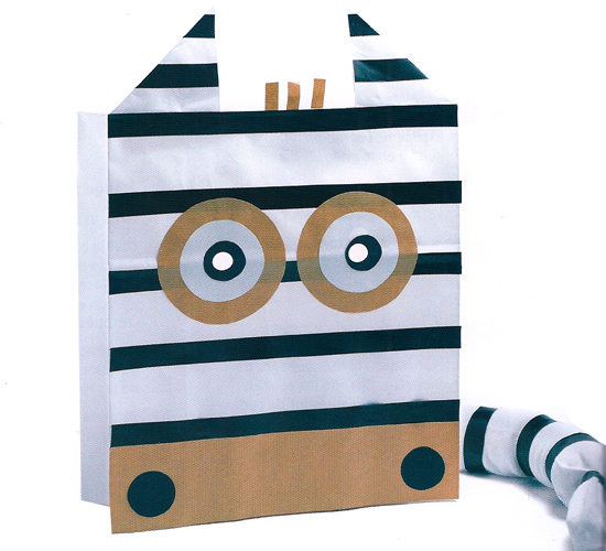 2-Para hacer los pelos de la cebra, cortaremos unas tiras de papel kraft y las pegaremos por detrás del borde de la bolsa, entre las orejas.