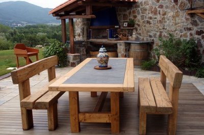 En este primer ejemplo, se han usado como base para los bancos de la mesa. El resto de la madera empleado no se ha aprovechado de unas traviesas, aunque se ha intentado mantener cierta armonía en todo el conjunto.