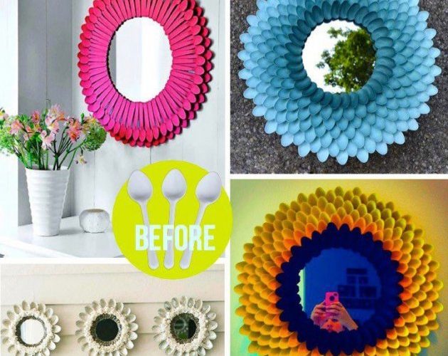 Espejo con cucharillas de plástico recicladas. En otras ocasiones te hemos mostrado cómo reutilizar las cucharillas de plástico para hacer lámparas de techo de manera sencilla. En esta ocasión, te traemos un ejemplo de espejos de pared realizados a partir de cucharillas de plástico.