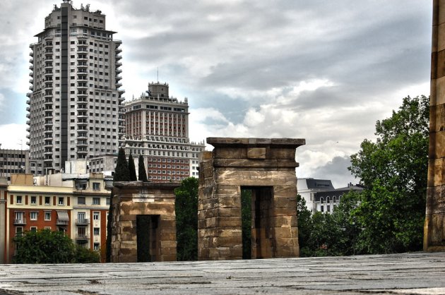 Esta panorámica tomada desde el templo de Debod nos ofrece la posibilidad de apreciar la grandiosidad de lo que hasta hace poco eran dos de los edificios más altos de la capital de España. Para los visitantes o curiosos que quieran dar un paseo por el Madrid centro les ofrecemos una ruta corta pero intensa que va desde el Templo Egipcio de Debod hasta la Puerta del Sol, recorriendo una parte del Madrid de los Austrias.