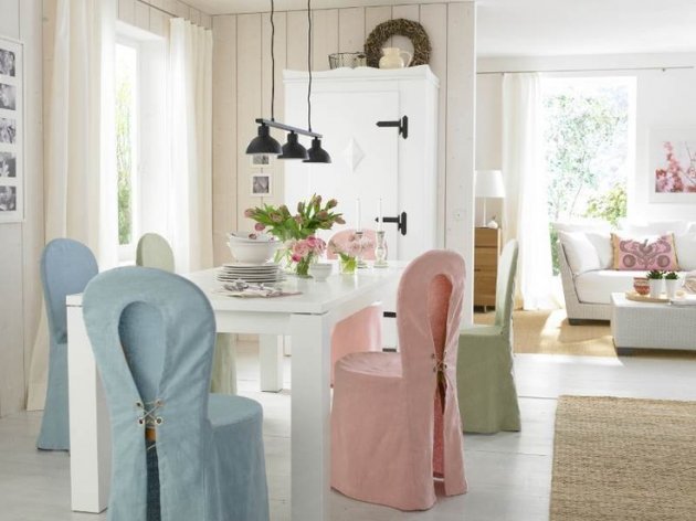 Fundas a medida. La otra alternativa consiste en realizar una funda a medida para nuestra silla o sillón, en este caso habrá que tomar medidas y realizar cortes de tela siguiendo la forma de la silla o el sillón. Aunque siempre está la opción de realizar un tapizado más o menos complejo, lo más sencillo es comenzar con cortes de tela en forma rectangular que vayas uniendo con costuras vistas a las que incluso puedas incorporar adornos como lazos, cordones, etcétera. Esta forma de realizar nuestra funda o forro para nuestra silla o sillón resulta bastante sencilla y asequible para la mayoría de manos inexpertas, aunque siempre podrás pedir ayuda a un tapicero y hacer un trabajo más fino.