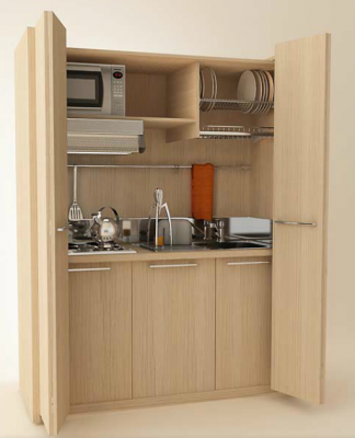 Las cocinas americanas tiene un elemento que de alguna forma delimita ambos espacios, sin embargo en el ejemplo que mostramos no existe tal separación ya que se trata de un mueble, parecido a un armario, que alberga en su interior todo lo necesario para cocinar.