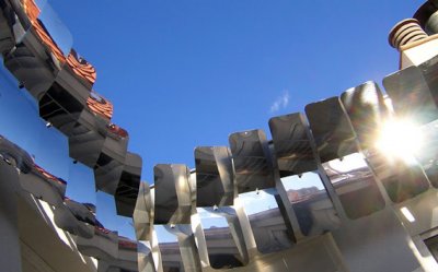El sistema de reflectores está formado por un conjunto de paneles reflectantes (puede tratarse de espejos) cuya particular geometría y sus diversas orientaciones consiguen captar y reflejar el sol durante todo el día y a lo largo de todo el año, con elementos fijos, sin movimientos ni mantenimiento, convirtiendo el patio en una verdadera caja de luz dentro del edificio.