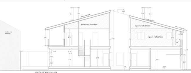 Este diseño en planta era realmente ineficiente, ya que por un lado, teníamos que construir 500 m², 250 m² por planta, lo que de por sí encarece enormemente la construcción. Además, nos veíamos limitados por el espacio, algo realmente increíble, ya que teníamos que meter todo el programa en una sola planta, lo que hizo que apareciesen espacios pequeños, grandes y largos pasillos, y en definitiva, una distribución muy forzada y absurda. Intentamos que el propietario entendiese que lo mejor era construir de una forma más compacta, pero al final no lo conseguimos, por lo que tuvimos que adaptarnos a sus exigencias. El coste de la construcción aumentó un 70% porque, entre otras cosas, y lo que es peor, había un 70% de volumen totalmente desaprovechado.