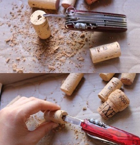 -Lo primero es perforar con cuidado los corchos con la ayuda de una navaja, un destornillador de punta plana o cualquier herramienta punzante.