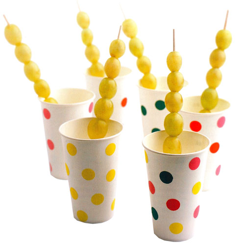 Para preparar nuestros vasos con uvas tendremos que decorar primeramente los vasos de papel con trozos de cartulina recortados en diversas formas y que pegaremos alrededor del vaso. Podemos hacer composiciones diferentes, desde círculos sencillos hasta formas más divertidas (estrellas, triángulos, etc…)