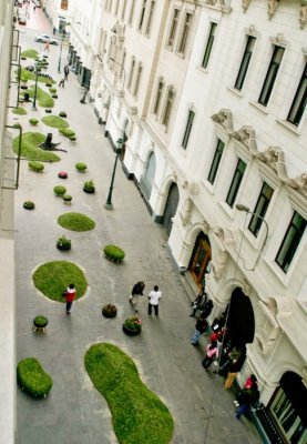 Proyecto de invasión Verde. Tenemos una propuesta que está a medio camino entre el diseño urbano y la jardinería. Se trata de recuperar el centro histórico de Lima. Esta propuesta se localiza en el pasaje Encarnación, una calle que inicialmente estaba destinada al uso exclusivo del peatón, pero que frecuentemente se utiliza como espacio para aparcar coches.