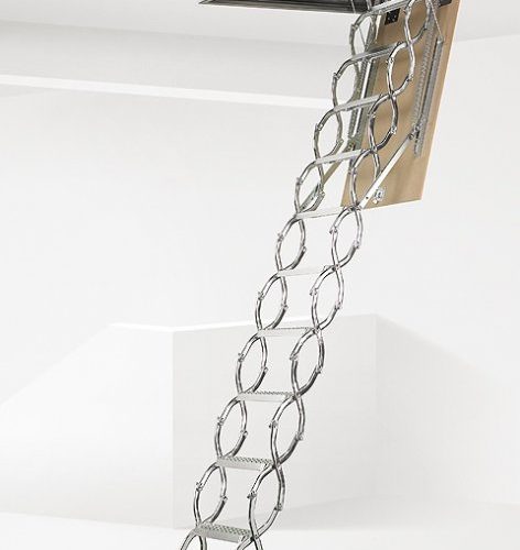 Las escaleras escamoteables de acordeón están formadas por una serie de perfiles metálicos que, unidos dos a dos a su centro geométrico y enlazados por los extremos con perfiles iguales, forman una estructura en forma de X que se abre y cierra el igual que el mecanismo de unas tijeras.