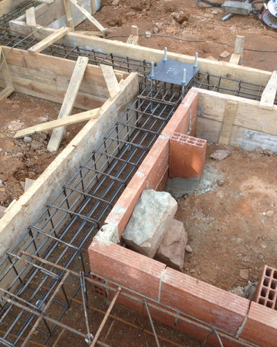 Rehabilitando una casa de campo. La cimentación. Nuestro ejemplo se basa en una rehabilitación, por lo que durante la ejecución aparecen condicionantes que no se tenian previstos al principio. Por ejemplo, parte de los muros existentes de la casa no apoyaban correctamente en firme, lo que condicionaba la excavación de las iniciales zapatas corridas para evitar descalzar los muros y que estos se derrumbasen. Al considerar que la profundidad de excavación era mayor de lo que habíamos previsto, lo que hacia difícil la excavación de zanjas (40cm por 1,5metros de profundidad), se decidió modificar el proyecto, y parte de la casa se cimentó con zapatas puntuales y otra parte con zapata corrida.