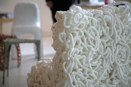 La estructura de este sillón esta realizada a base de almidón de patatas y recibe el nombre de Starch Chair. El sillón está realizado con la espuma obtenida de la extrusión de patatas que al solidificarse crean unos hilos lo suficientemente rígidos como para soportar el peso de una persona.