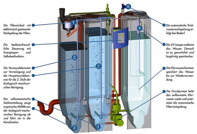 El sistema utilizado para reciclar el agua consiste en el tratamiento biomecánico sin productos químicos. El depósito de reciclado se puede colocar en cualquier parte del edificio y funciona de manera automática, casi sin mantenimiento. El agua que llega usada primeramente se filtra y a continuación los bio-cultivos descomponen el agua gris y por último, es esterilizada por una lámpara de luz ultravioleta.