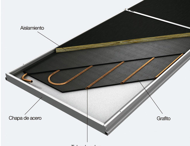 Uno de estos sistemas de techo radiante es el desarrollado por la empresa Zehnder, que ha creado un panel radiante realizado a partir del grafito natural como conductor térmico. El grafito, al igual que la pizarra, son materiales naturales que resisten bien las altas temperaturas y no son corrosivos, por lo que su mantenimiento se reduce bastante. El grafito tiene unos buenos valores de transmisión de calor y funciona bien a temperaturas de agua bajas, además de tratarse de un material 100% reciclable.