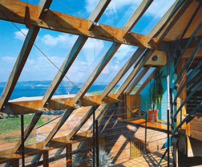 El uso de muros de tierra compactaba ayuda a aprovechar el calor generado de una manera más eficiente gracias a la inercia térmica. Las grandes superficies acristaladas de esta vivienda provocan el efecto invernadero, y por consiguiente el calentamiento de los muros, consiguiendo un efecto parecido a lo que sucede en el muro trombe.