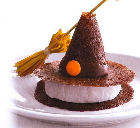 Cuando los medios discos estén calientes, levántalos con una pala fina, dales forma de cono y dejarlos enfriar. Moja los conos en el chocolate derretido y coloca cada uno sobre un disco. Decora el sombrero con una gragea de chocolate y rellena el espacio entre los dos discos con el helado.
