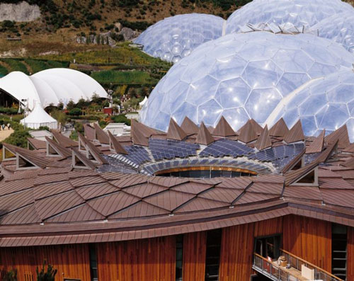 Una cubierta de cobre al lado de una cubierta geodésica. En el pueblo minero de Saint Blazey, en Cornualles al suroeste de Inglaterra, se levantó un impresionante invernadero cerca de donde existía una antigua mina de arcilla. Un invernadero que contiene alrededor de 1 millón de especies de plantas diferentes, un recuerdo de lo que se supone que fue el legendario jardín del edén, que según la Biblia albergaba a todas las plantas agradables a la vista y que se podían comer.