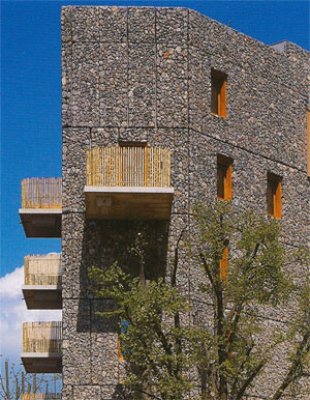 Para conseguir este efecto, cada pieza rectangular se separa de la otra 5cm. son elementos creados individualmente y posteriormente colocados (anclados a la fachada). Cada pieza se envuelve en una malla de gallinero, que ciertamente no sabemos para que se utilizará, es posible, que la intención sea que el día de mañana aparezcan plantas trepadoras por toda la fachada.