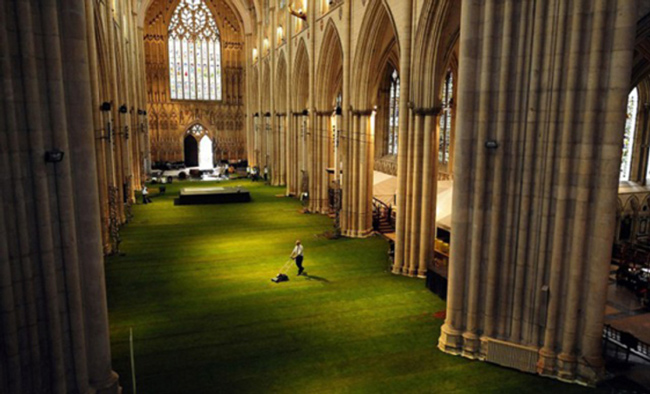 Una decoración extravagante. Hoy nos hemos levantado peleones y quizás por ello veamos en este ejemplo de decoración más cosas negativas que positivas, sinceramente, creo que tiene que ver mucho la situación geopolítica mundial que día tras día nos da motivos para sentirnos menos orgullosos de nosotros mismos, y claro, cuando ves que mientras unos mueren injusta e indiscriminadamente a manos de los intereses de unos pocos y por otro lado te muestran imágenes como las de la Catedral de York Minster con el suelo cubierto de césped, piensas muchas cosas.