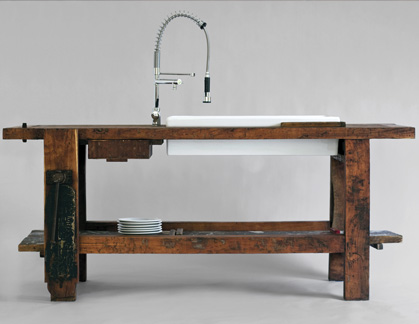 Tanto el lavabo como la grifería (de acero inoxidable) son perfectamente funcionales, contrastando con las vetas gastadas de los viejos tablones de madera que configuraban la vieja mesa.