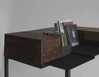 La mesa parte de viejas cajas de madera que han sido restauradas y tratadas debidamente con ceras y tintes dándoles un aspecto viejo y usado. Cada caja encaja perfectamente en un estructura de base metálica hecha a partir de chapas de acero plegadas a distintas alturas. La mesa se completa con un juego de sillas realizadas a partir de la misma idea: una estructura de apoyo de acero donde se apoyan unas cajas de madera.