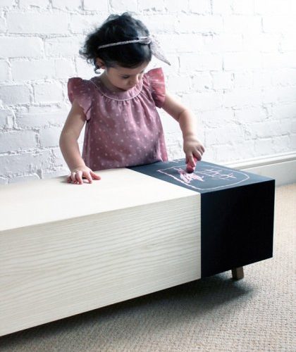 Esta sencilla mesa de madera tiene un revestimiento pizarroso que permite pintar libremente sobre ella y limpiarla posteriormente con un trapo humedecido. Esta original mesa no es solamente un mueble práctico y funcional para que los niños tengan un sitio donde pintarrajear sin ningún problema, también es un bonito y estético complemento para nuestros salones que nos puede servir como mesa de café o mesa baja.