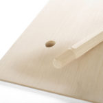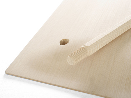 Los materiales utilizados son la madera de balsa y el álamo para el tablero y el fresno macizo para las robustas patas que tienen una sección hexagonal que da más robustez al apoyo. Estas patas se atornillan a la base del tablero de forma sencilla pudiéndose nivelar sin ningún problema en todo tipo de suelos.