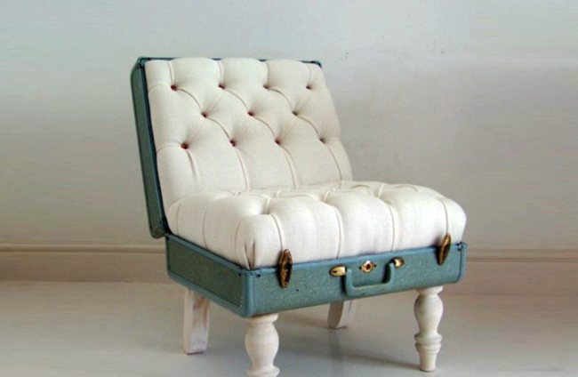 Una mesa y un sillón hechos a partir de una vieja maleta