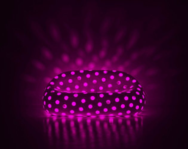Como puedes ver en las fotografías, esta moderna butaca nos permite introducir iluminación en el interior y crear efectos muy llamativos de luz y de color, combinando simplemente distintos tipos de lámparas en un divertido juego de ingenio y originalidad.