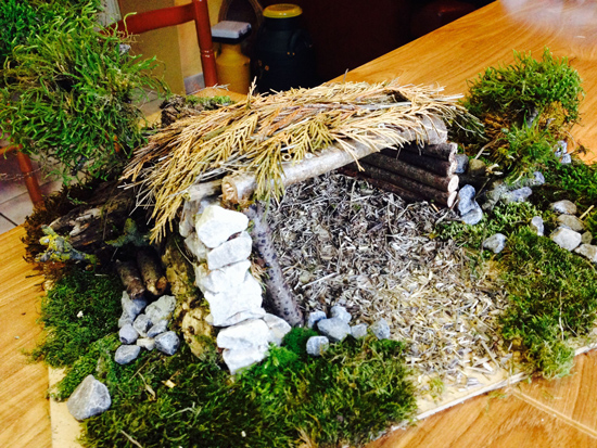 El resto es sólo imaginación. En nuestro pesebre hemos aprovechado las pequeñas piedras para hacer uno de los muros, que además hemos decorado con pequeños trozos de musgo, el otro muro lo hemos levantado con trozos de ramas cortas que hemos cortado previamente, y que también nos han servido para hacer la techumbre, que posteriormente hemos cubierto con un ramitas secas. El suelo lo hemos cubierto con ramitas secas, algo de musgo y un poco de arena.