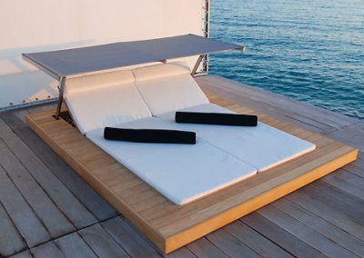 Esta tumbona esta realizada con madera de y acero inoxidable, sin duda se trata de una creación realmente moderna y original. La tumbona viene con colchones y cabeceras, vestidos de blanco Sunbrella ® de tela completamente desenfundable.