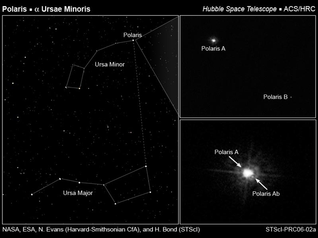 Polaris, la estrella polar, es una estrella fácil de encontrar, localiza primero un grupo de siete estrellas con forma de carro grande de la constelación de la osa mayor. Después traza imaginariamente una línea que una las estrellas en la base del carro y prolonga esta linea cinco veces hasta localiza Polaris, la estrella más brillante de la osa mayor, que también tiene forma de carro, aunque más pequeño