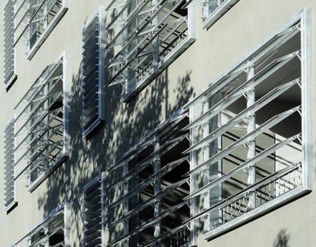 Ventanas de lamas de celosía. Esta ventana de lamas de celosía de vidrio está fabricada con perfiles de aluminio extrusionado y acabado mate o lacado con color.