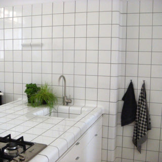 Decoración de cocina utilizando sólo azulejos en todo el mobiliario