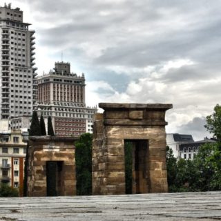 Foto templo de Debod y torres de plaza de España. Una bonita imagen del templo de Debod con las torres de la plaza de España al fondo