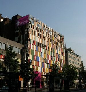 Un edificio con una fachada de puertas de madera. Una interesante manera de reciclar las puertas de madera