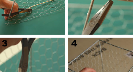 3-Pegaremos una hoja a modo de plantilla. Haremos cuidadosamente unos agujeros con la ayuda de los clavos y el martillo.